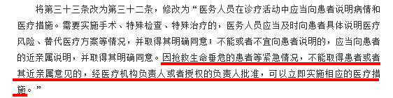 因搶救生命垂危的患者等緊急情況,不能取得患者或者其近親屬意見的,經(jīng)醫(yī)療機(jī)構(gòu)負(fù)責(zé)人或者授權(quán)的負(fù)責(zé)人批準(zhǔn),可以立即實(shí)施相應(yīng)的醫(yī)療措施。