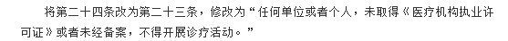 《條例》修訂后的第二十三條規(guī)定,任何單位或者個(gè)人,未取得《醫(yī)療機(jī)構(gòu)執(zhí)業(yè)許可證》或者未經(jīng)備案,不得開展診療活動(dòng)。