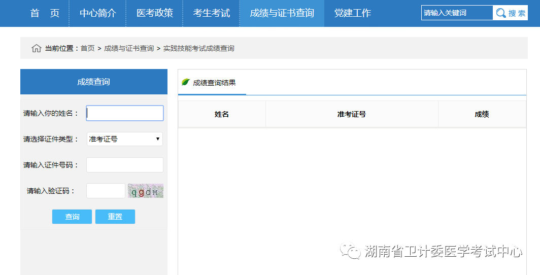 登陸湖南醫(yī)考網(wǎng),點(diǎn)擊成績與證書查詢菜單下的實(shí)踐技能考試成績查詢選項(如下圖)